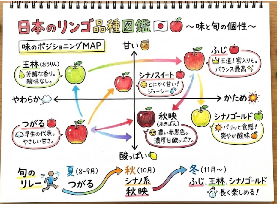 一般的なりんごの品種で早く出回るのは「つがる」で、その後に青りんごの代表格「王林(おうりん)」、甘酸っぱい「紅玉(こうぎょく)」、「ふじ(サンふじ)」、爽やかな黄色りんごの「シナノゴールド」などが続きます。