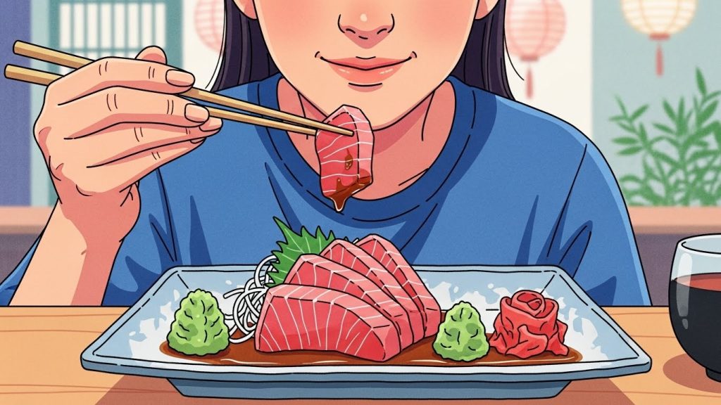 ① まぐろを1㎝幅の削ぎ切り、山芋を7㎝の長さの短冊切りにします。