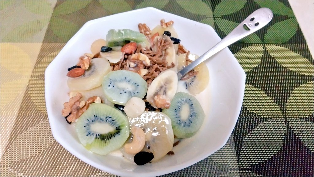 フルーツとナッツをたっぷりとトッピングしたシリアル、