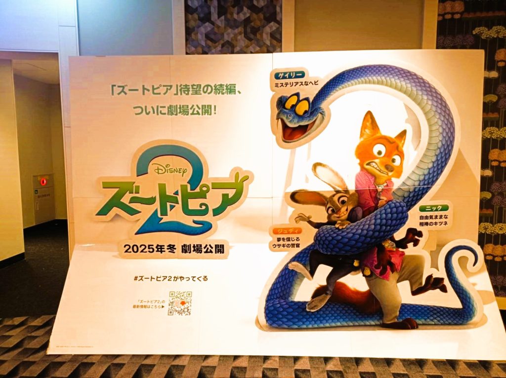 映画館には、ズートピア2の展示物がたくさんあり、