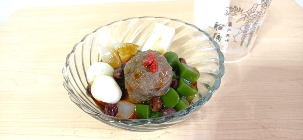 まずは船橋屋さんの10月限定あんみつ「甘栗と抹茶のあんみつ」です。