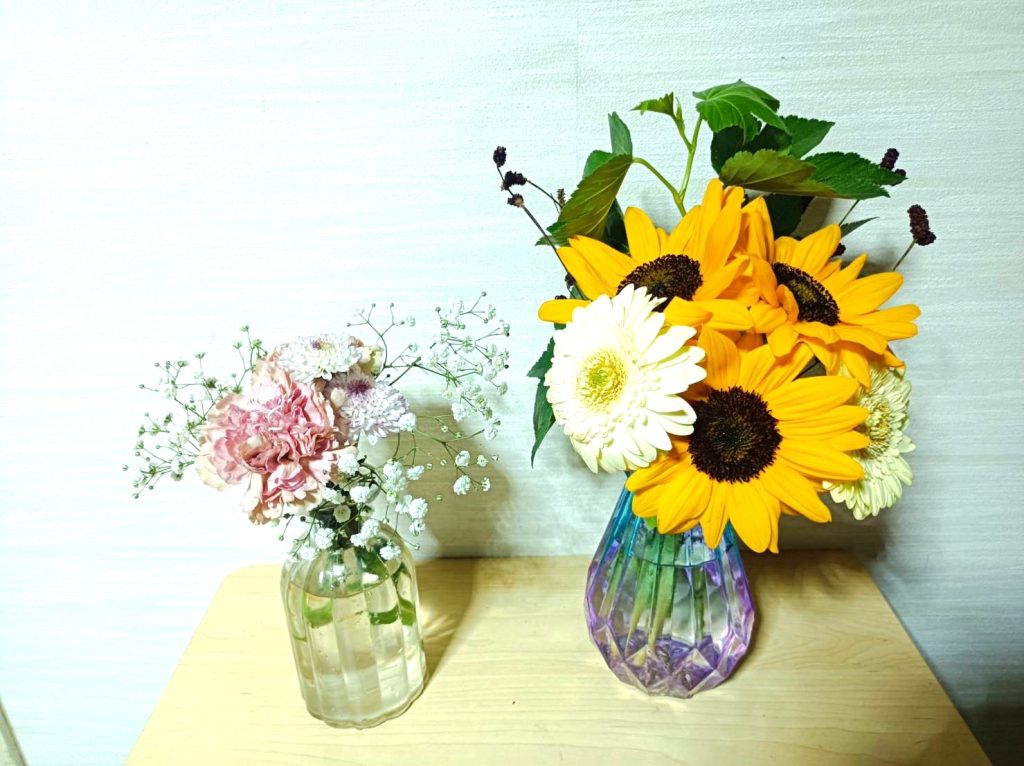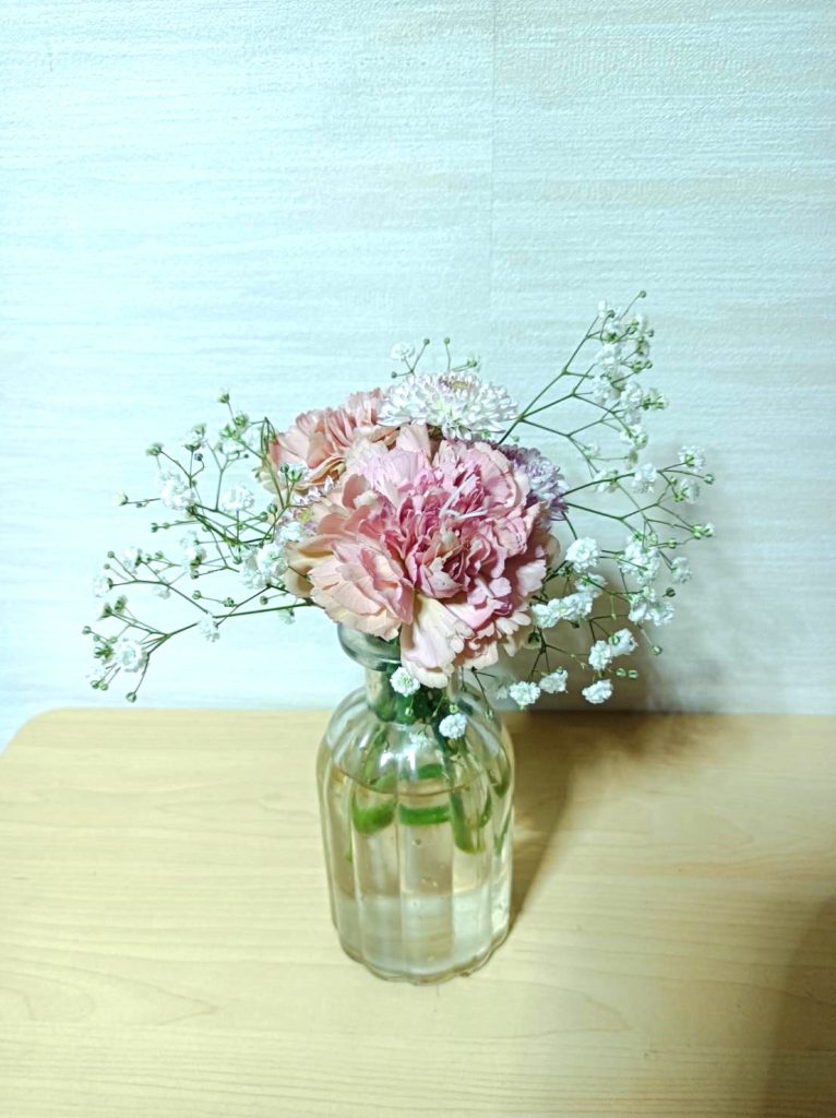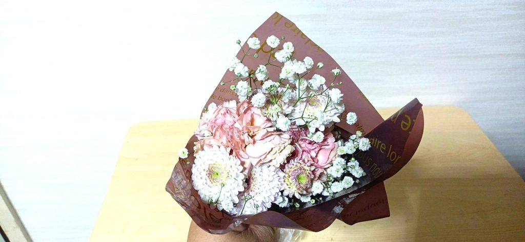 今回は、「自分へのご褒美」として、自分のために買ってきた花束と、