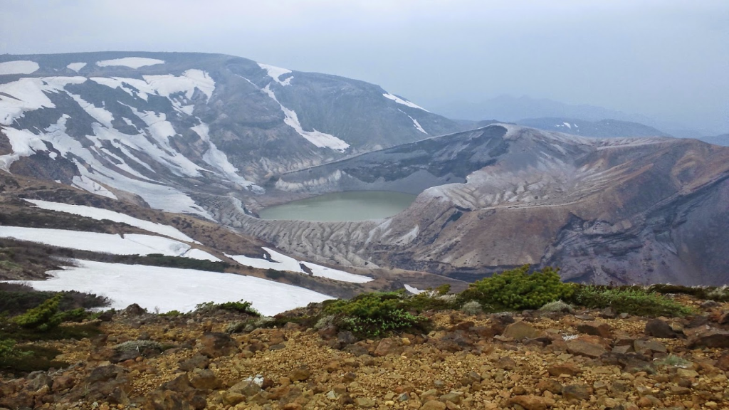 御釜」は周囲約1kmで直径約325m、水深の最も深い場所で27.6m、強酸性の水質のため、生物は生息していないといわれています。