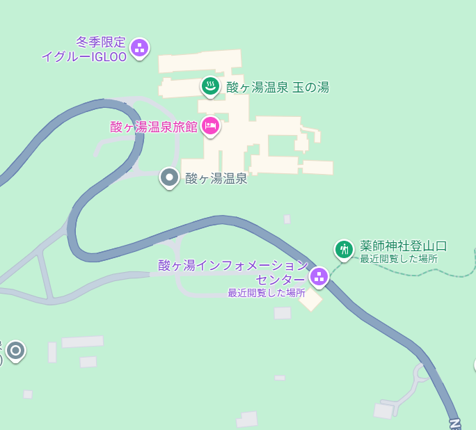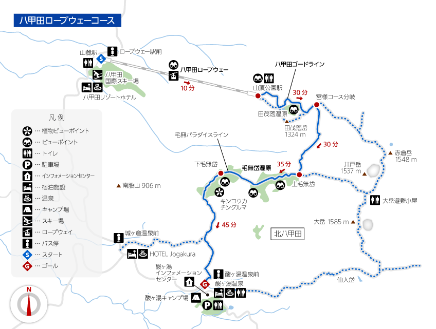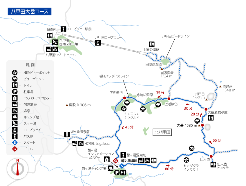 青いSの地点から赤いGの地点の酸ヶ湯温泉を起点に反時計回りで周回します。