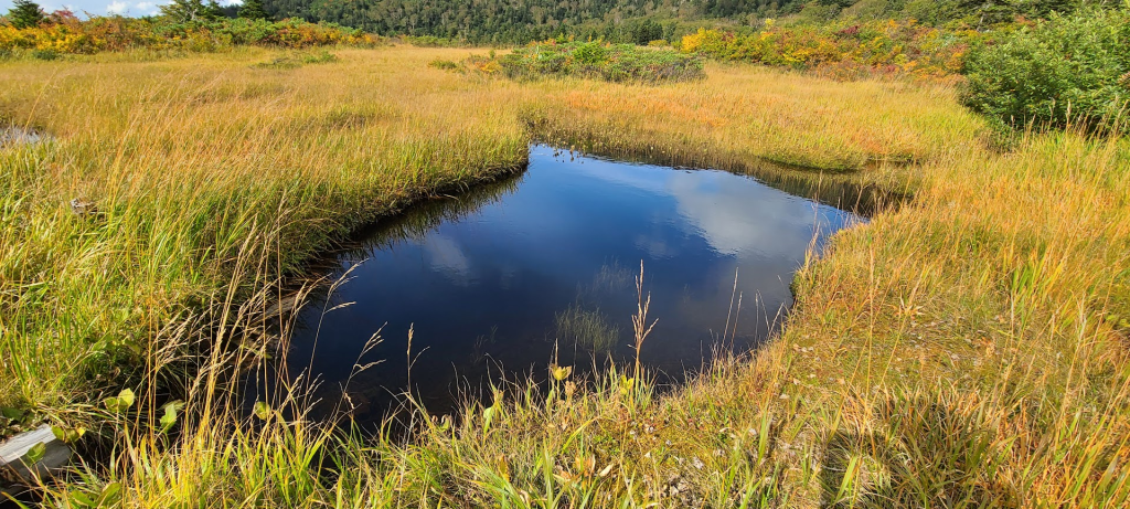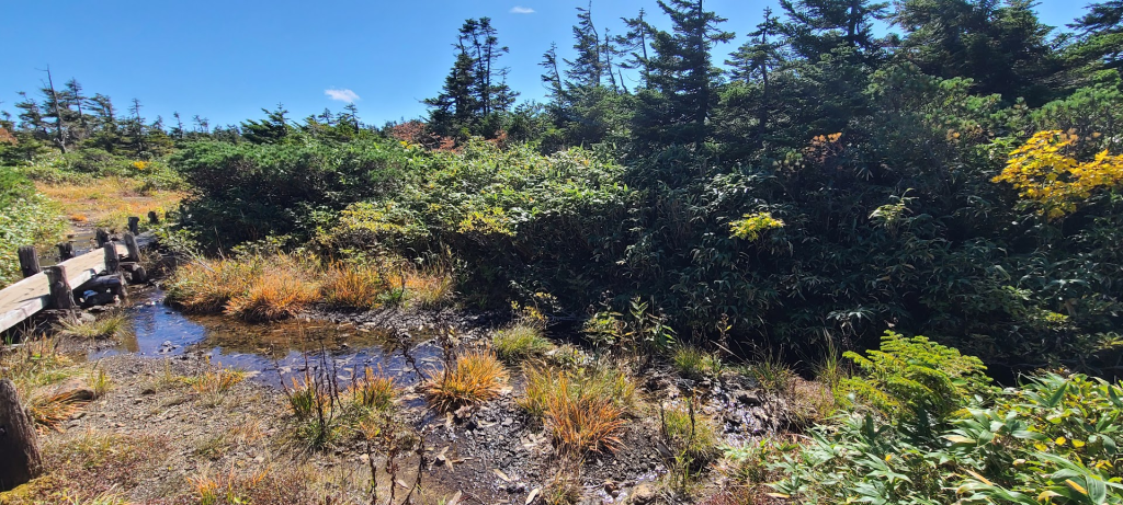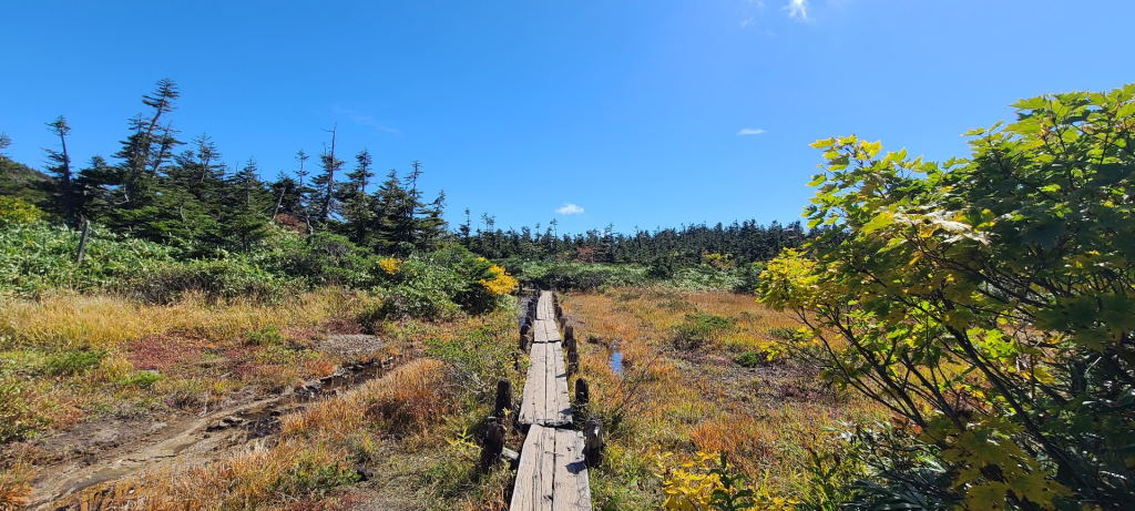 「地獄湯の沢」を登り切ると湿原地帯に入ります。