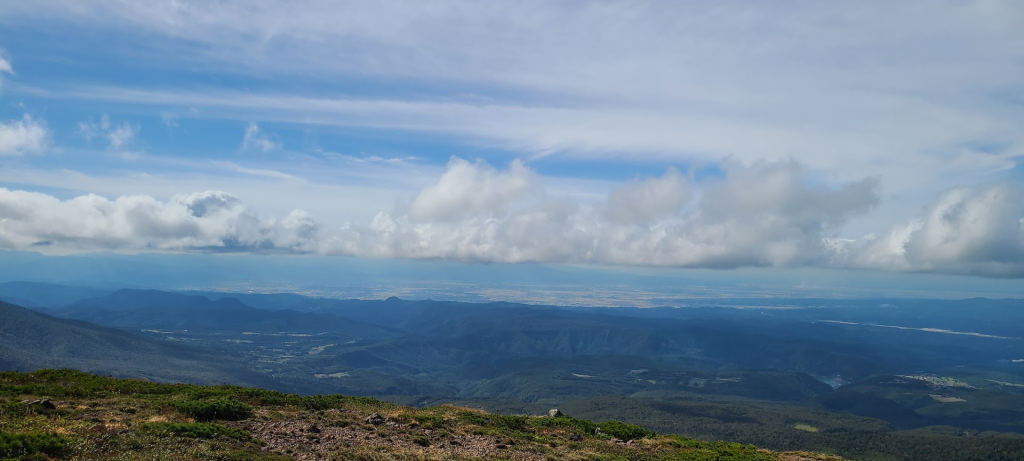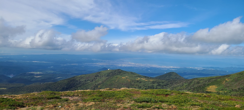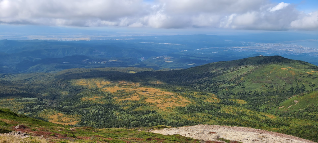 弘前市方面には楽しみにしている「毛無岱(けなしたい)」が見えます。