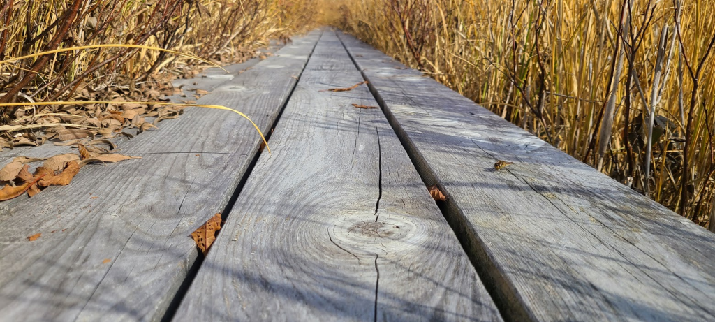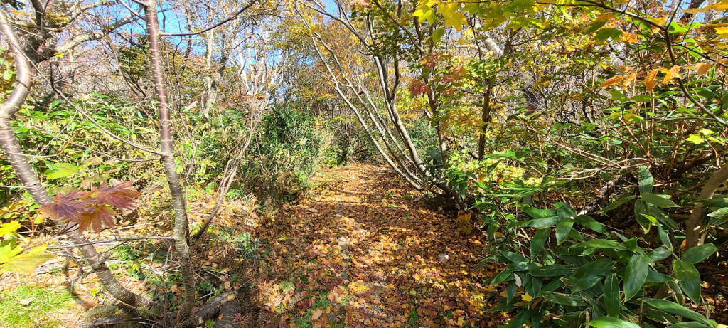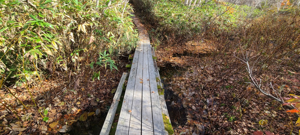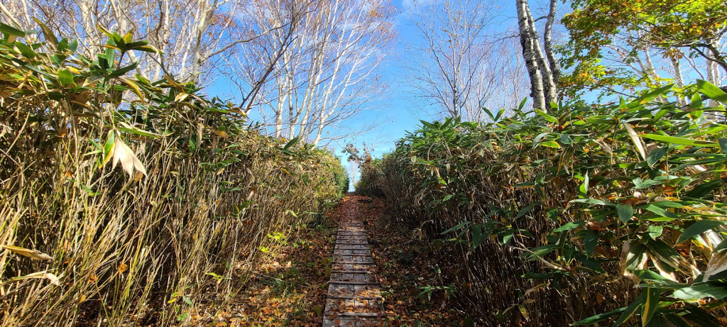 5分ほど樹林帯を進むと木道が見えてきて景色が開けてきます。