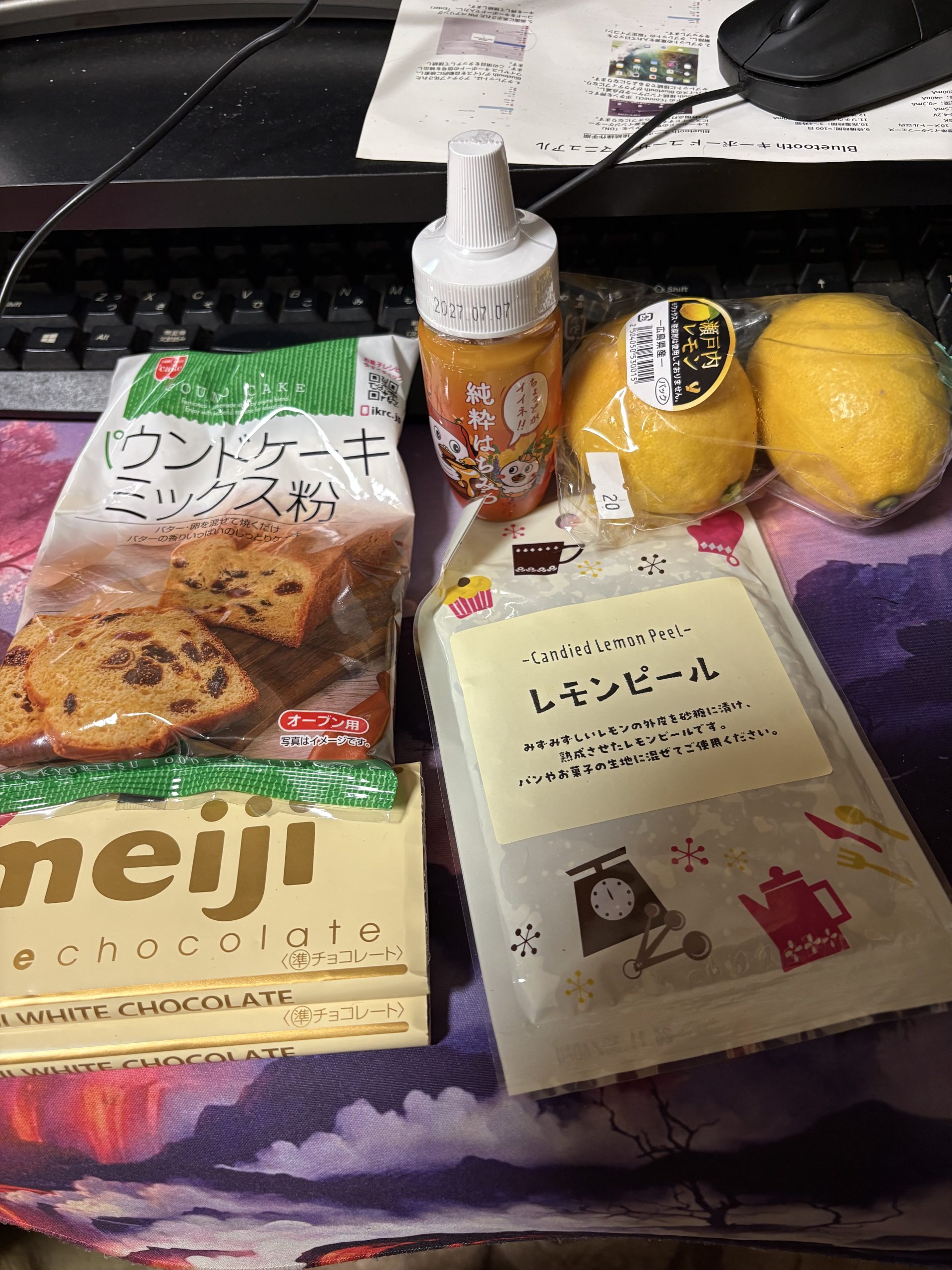 Amazonでも買えるパウンドケーキミックス粉、はちみつ、レモン(皮も使うので、一応国産を選びました)、ホワイトチョコ、レモンピール。あとは家にある紅茶パックを使います。