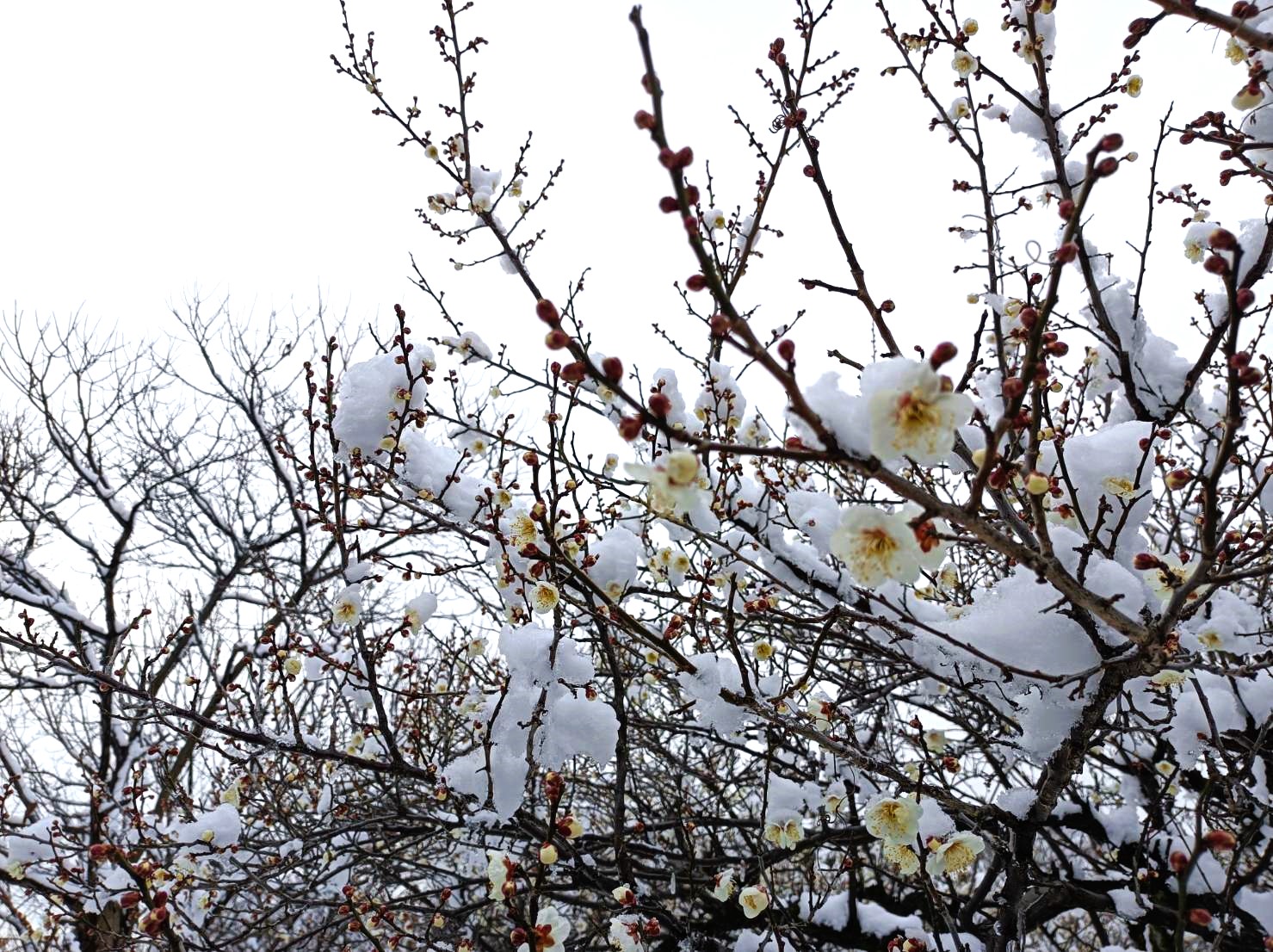 梅の花に雪が降り積もる、美しい光景を見ることができました。