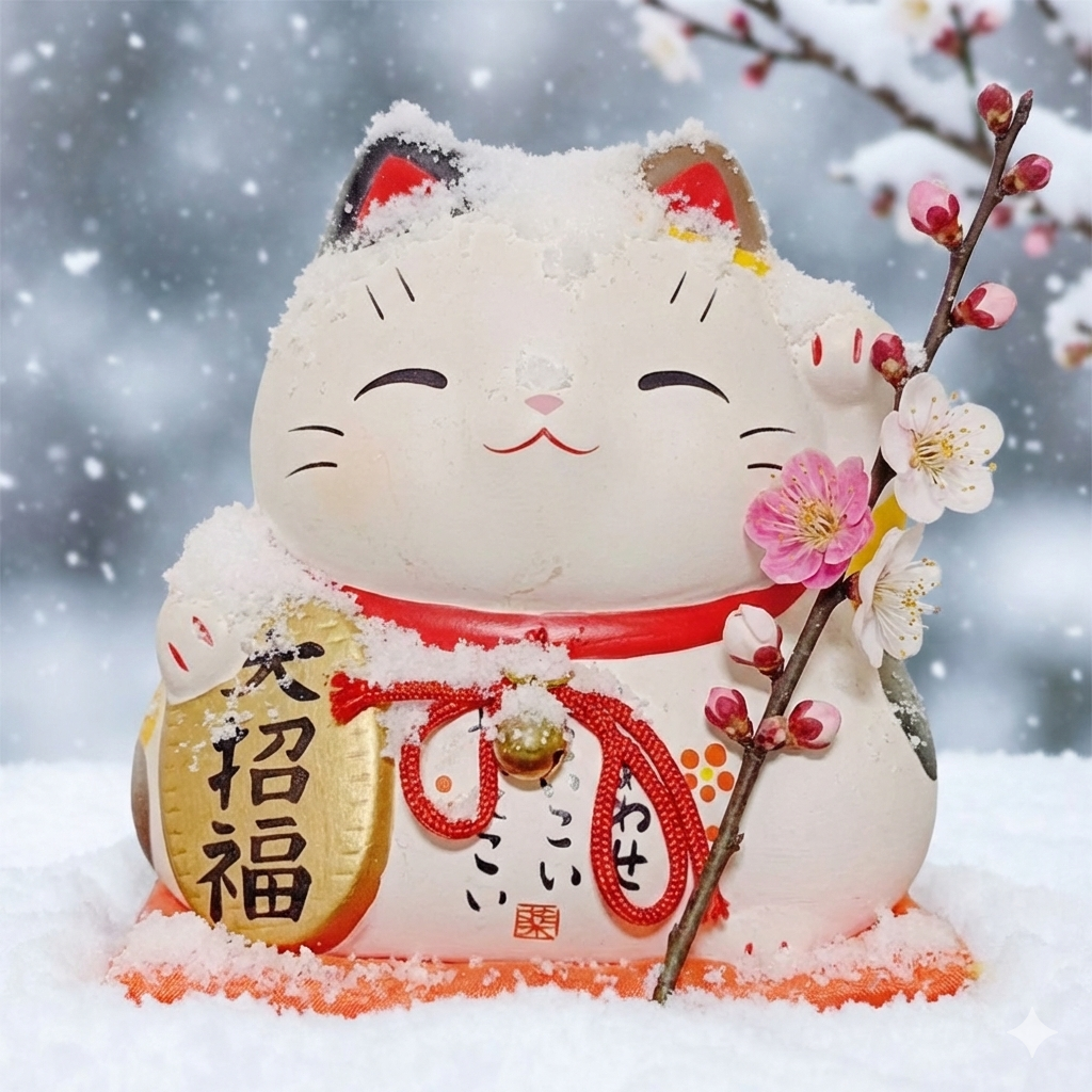 定番の招き猫アイコンも、雪を積もらせ、梅の花を持っているように、